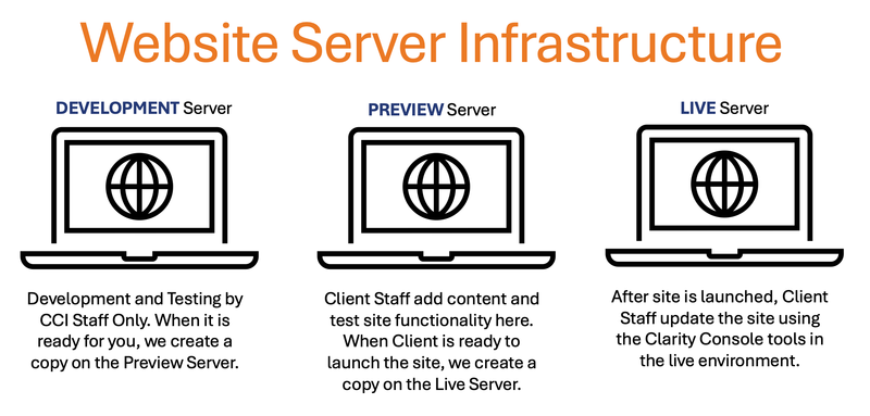 After training, you will work on adding content to your site on our PREVIEW Server. This site is only accessible via the URL we provide. 'The World' will not see it until it is launched on our LIVE server.