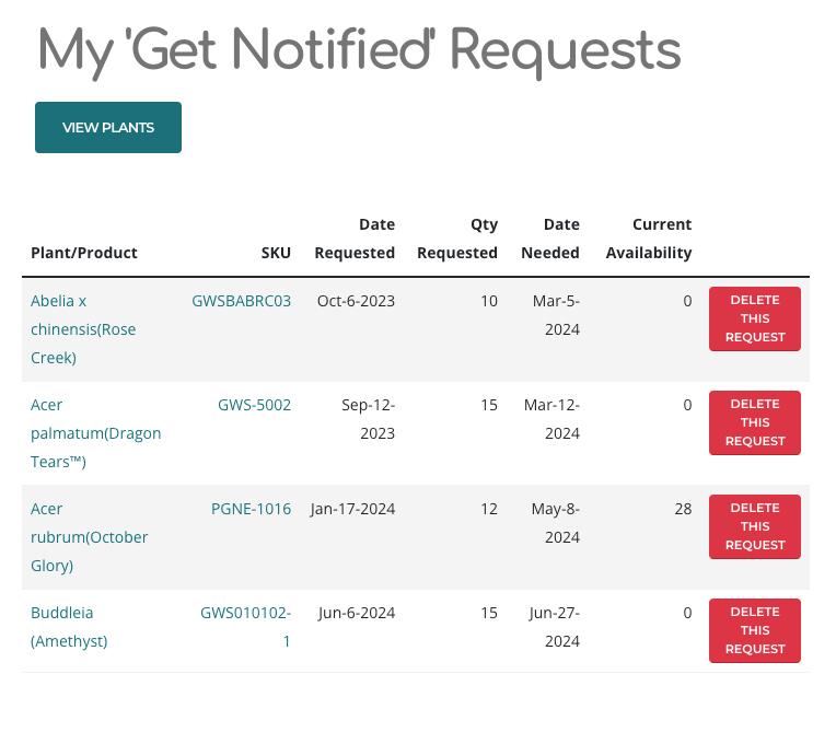 When an active plant record has zero items available for sale, a "Get Notified" link will be displayed on the corresponding plant detail page. This functionality allows you to see the demand for a plant you are not carrying or are out of stock.